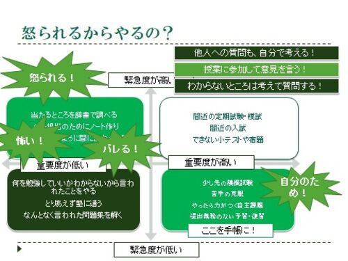 手帳の話、目標設定の話、科目別の学習方法、苦手の克服などを紹介するためにも、やっぱり理論的なところからタスク管理の話を進めます。 というわけで、今回は、重要な課題を緊急な課題より優先する、という話。